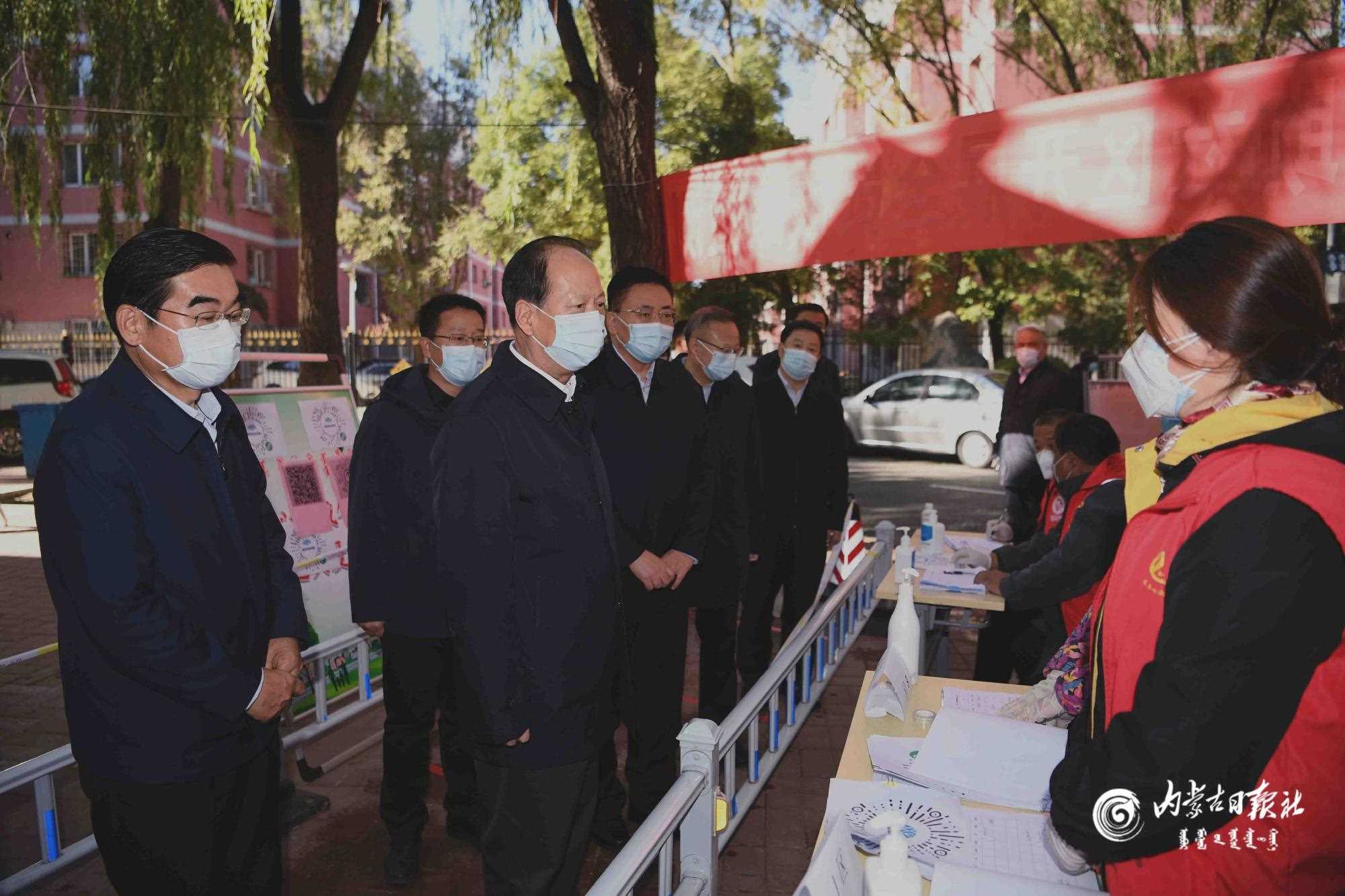 10月26日,自治區(qū)黨委書記、人大常委會主任石泰峰在學府花園小區(qū),檢查入口健康碼查驗、體溫檢測、值班值守等情況,并來到核酸檢測采樣點,仔細察看采樣登記流程。內(nèi)蒙古日報社融媒體記者 袁永紅 攝