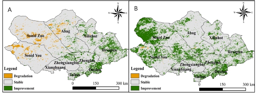 渾善達克沙地植被質量變化空間分異參考基線(A)與現(xiàn)狀(B) 。圖源:中國林科院荒漠化研究所
