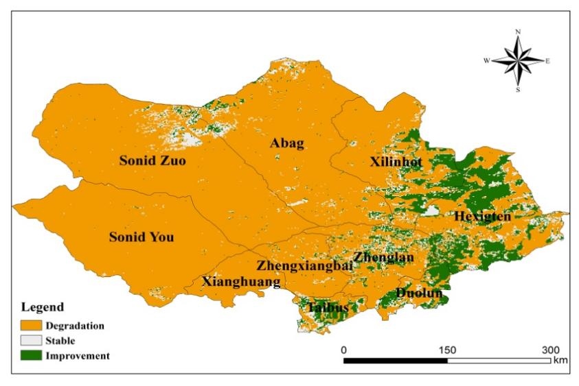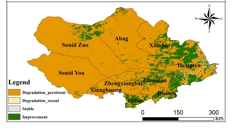 2000—2020年近21年渾善達克沙地生態(tài)質量變化空間分異。圖源:中國林科院荒漠化研究所