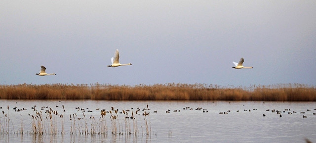 蘆葦蕩漾,鴻雁飛翔。此刻,鳥類攝影愛好者馬海明扛起他的相機,駕著破冰艇駛向烏梁素海的深處。他平靜地說:“再過些日子,這里的鳥更多、魚更歡,拍出來的照片會更美更精彩?!?/p>