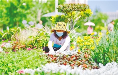 7月13日,工作人員在呼和浩特市草原絲綢之路文化公園維護(hù)、修整花境。據(jù)了解,呼和浩特市園林建設(shè)服務(wù)中心2022年在全市范圍內(nèi)打造19個花境,目前已全部建設(shè)完成。不同花境采取不同主題,景色錯落有致,讓市民們走出家門就可欣賞唯美詩意的生態(tài)花境。(內(nèi)蒙古日報社融媒體記者 王磊攝)