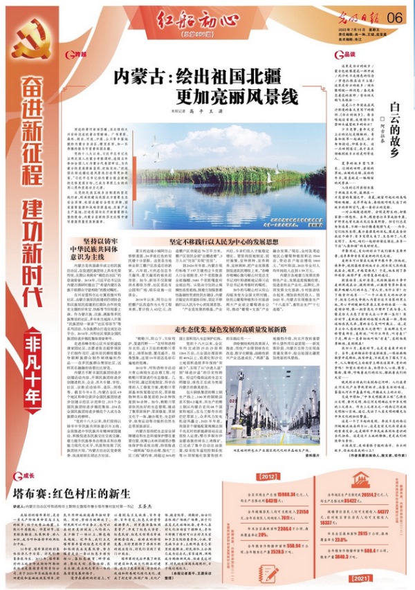 7月15日,《光明日?qǐng)?bào)》6版刊發(fā)《奮進(jìn)新征程建功新時(shí)代·非凡十年|內(nèi)蒙古:繪出祖國(guó)北疆更加亮麗風(fēng)景線》,全文如下: