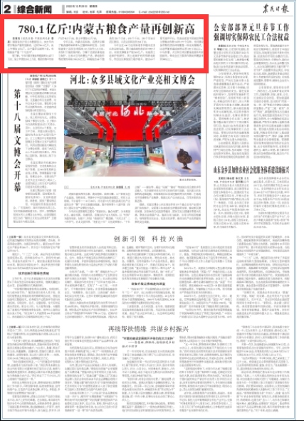 12月29日,《農(nóng)民日?qǐng)?bào)》2版刊發(fā)《780.1億斤!內(nèi)蒙古糧食產(chǎn)量再創(chuàng)新高》,報(bào)道2022年內(nèi)蒙古糧食產(chǎn)量實(shí)現(xiàn)“十九連豐”,再創(chuàng)新高!