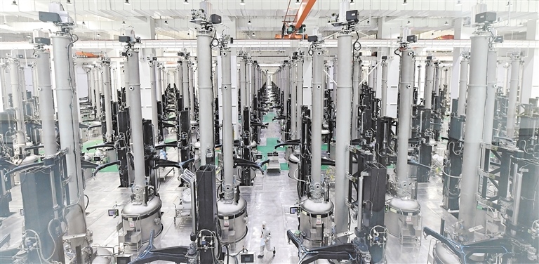 “這個(gè)車間出來(lái)的單晶硅棒是用在光伏領(lǐng)域的,切成硅片后,應(yīng)用于下游的電池片、組件、電站?!眱?nèi)蒙古中環(huán)晶體材料有限公司技術(shù)總監(jiān)王林告訴記者。