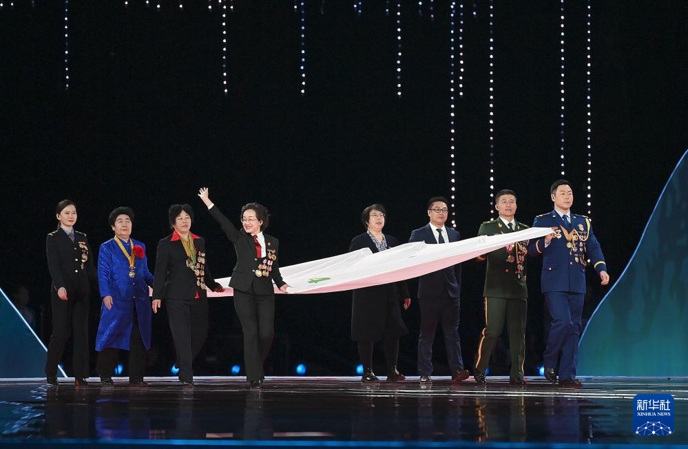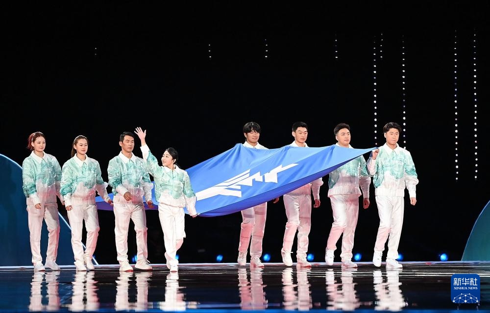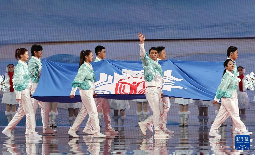 ??2月17日,中華人民共和國第十四屆冬季運(yùn)動會會旗在開幕式上入場。新華社記者 楊晨光 攝