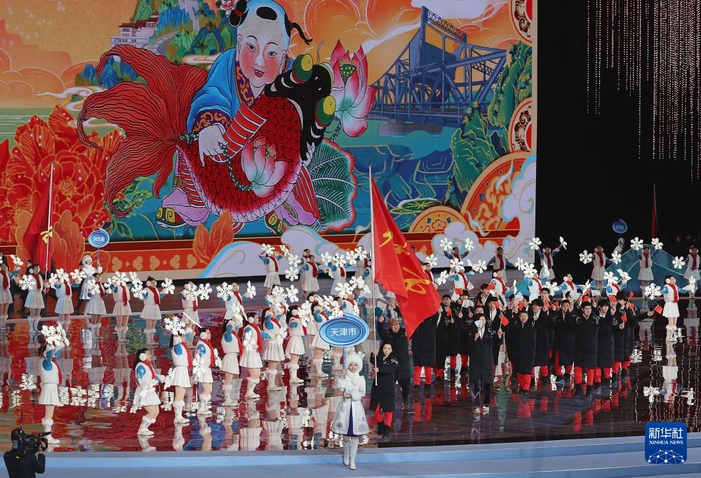 ??2月17日,天津市體育代表團(tuán)在開幕式上入場。新華社記者 姜帆 攝