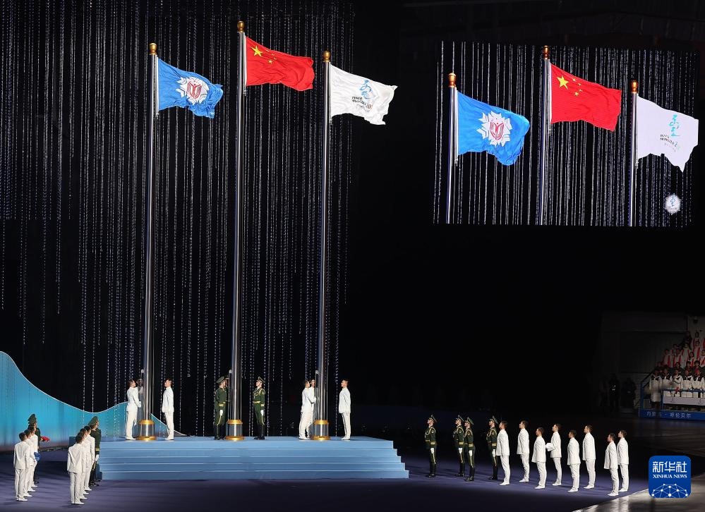 ??2月17日,中華人民共和國第十四屆冬季運(yùn)動會會旗入場。新華社記者 連振 攝