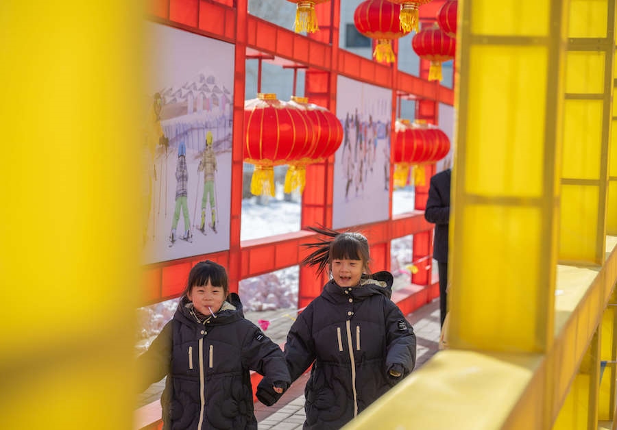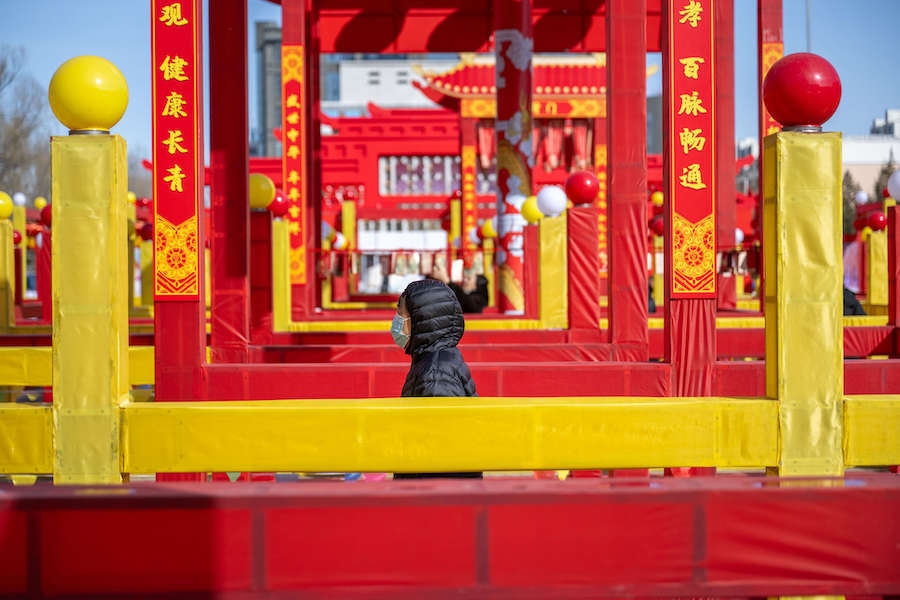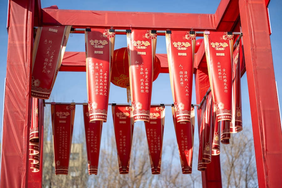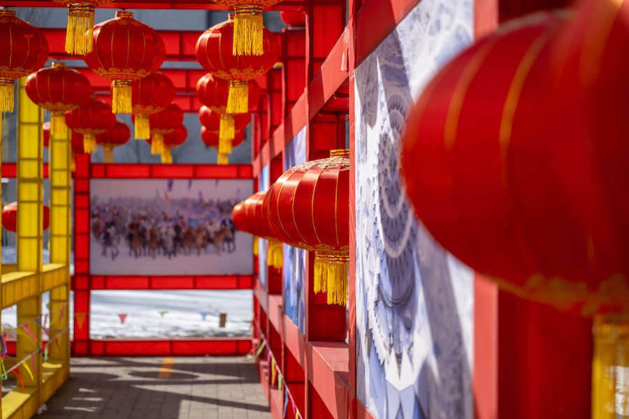在內(nèi)蒙古展覽館的九曲陣中設有八個關口,每個關口懸掛著印有感黨恩、北疆文化、冰雪旅游、中華詩詞、傳統(tǒng)年俗等有關的知識問答彩旗。