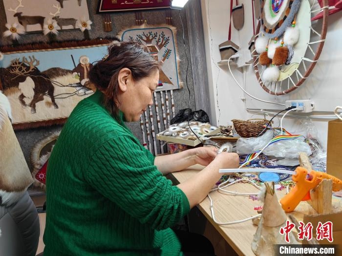 2月21日,在內(nèi)蒙古呼倫貝爾市鄂溫克族自治旗一家手工藝品工作室內(nèi),烏仁在制作太陽(yáng)花手工藝品?! ∮诩? 攝