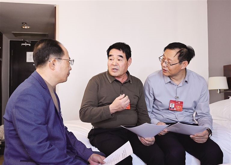 3月4日,住我區(qū)全國政協(xié)委員阿拉騰達(dá)來(左)、廷·巴特爾(中)、曹金山(右)在住地,就進一步提高草原生態(tài)保護補助獎勵標(biāo)準(zhǔn),為打贏“三北”工程攻堅戰(zhàn)和三大標(biāo)志性戰(zhàn)役奠定政策基礎(chǔ)的提案進行討論。草原全媒·內(nèi)蒙古新聞網(wǎng)記者 韓卿立 攝