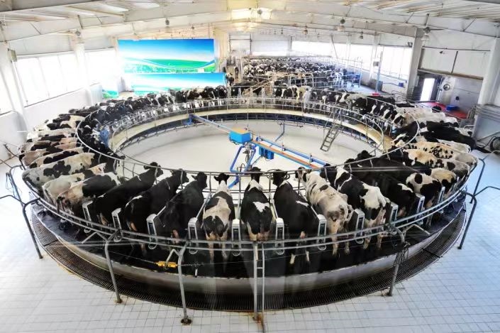 伊利牧場轉(zhuǎn)盤式擠奶現(xiàn)場。