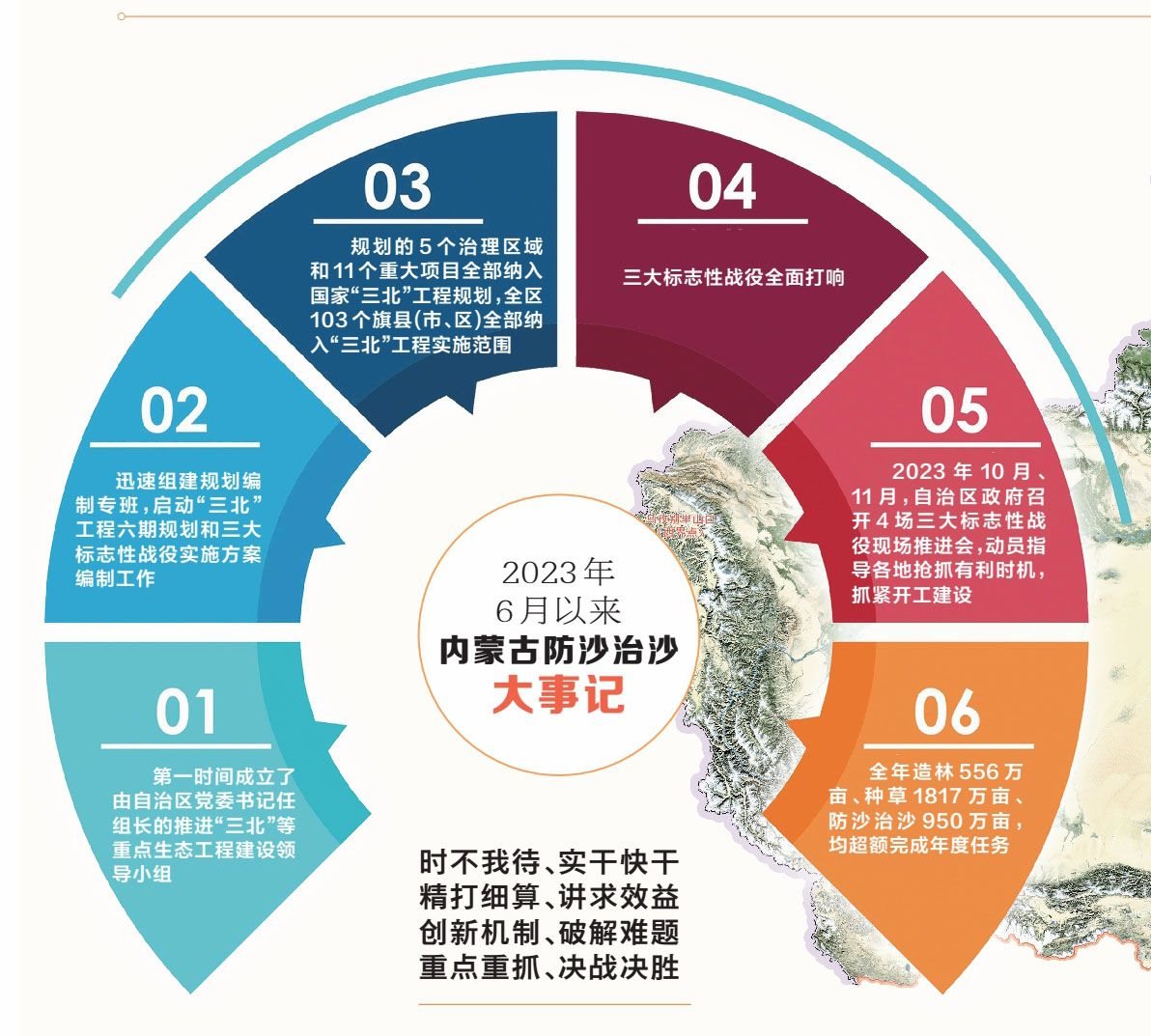 猶記得2023年的6月,習(xí)近平總書記親臨內(nèi)蒙古考察,主持召開了加強(qiáng)荒漠化綜合防治和推進(jìn)“三北”等重點生態(tài)工程建設(shè)座談會,發(fā)出堅決打好“三北”工程攻堅戰(zhàn)、努力創(chuàng)造新時代中國防沙治沙新奇跡的動員令,并親自部署了“三北”工程三大標(biāo)志性戰(zhàn)役。