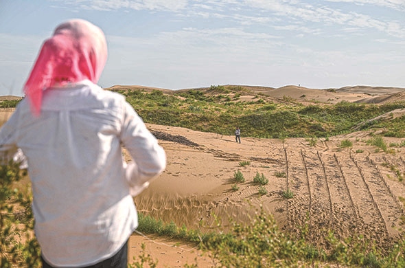??治沙戰(zhàn)役開展得更加轟轟烈烈,早在上世紀五六十年代,一場全民參與的防風固沙戰(zhàn)役就在鄂爾多斯大地打響。當?shù)匕傩諑资耆缫蝗眨坏酱禾炀烷_始設置沙障、種植樹苗,涌現(xiàn)出殷玉珍、吳向東、曹扎娃等一大批治沙勞模?,F(xiàn)在,沙漠大數(shù)據(jù)分析技術、種質資源技術、無人機飛播技術等現(xiàn)代治沙科技大大提高了生態(tài)治理水平,更進一步賦能綠色發(fā)展。