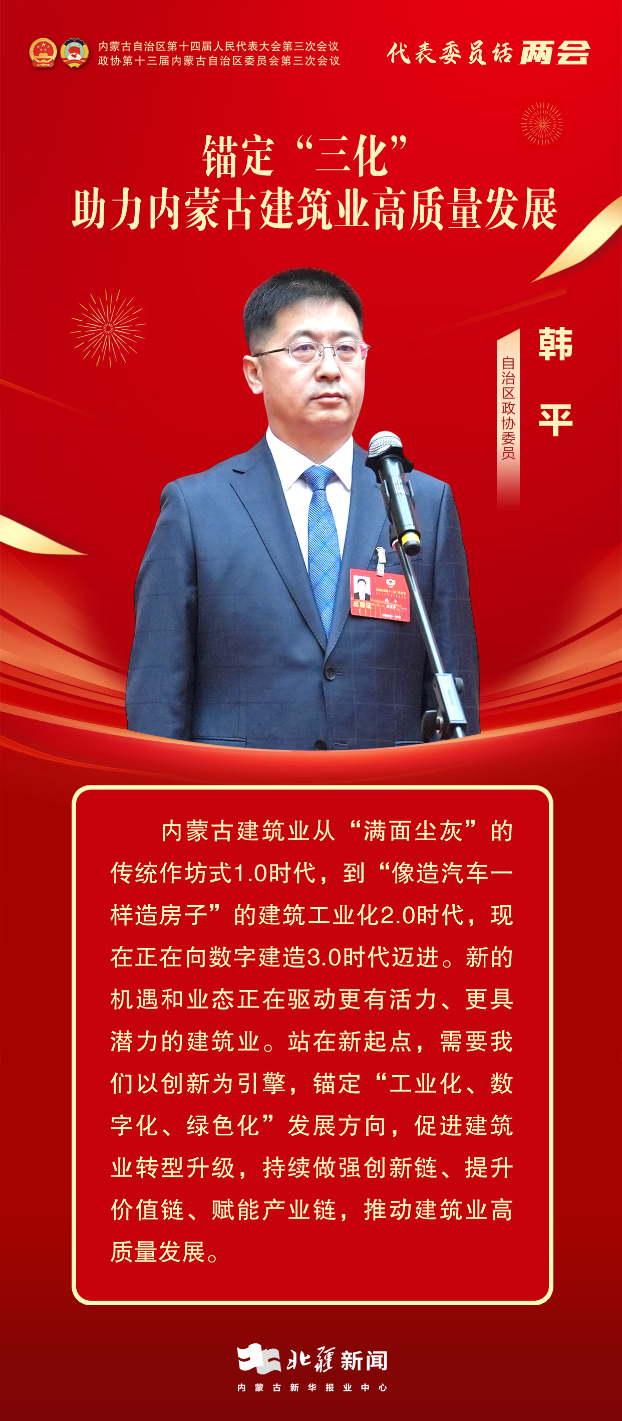 北疆新聞呼和浩特1月13日電(記者 張鑫 李姝廷)委員通道,通民心、道發(fā)展。1月13日上午,自治區(qū)兩會首場“委員通道”正式開啟。自治區(qū)政協(xié)委員,興泰建設(shè)集團有限公司黨委書記、董事長韓平圍繞“建筑業(yè)高質(zhì)量發(fā)展”的內(nèi)容建真言、獻(xiàn)良策。
