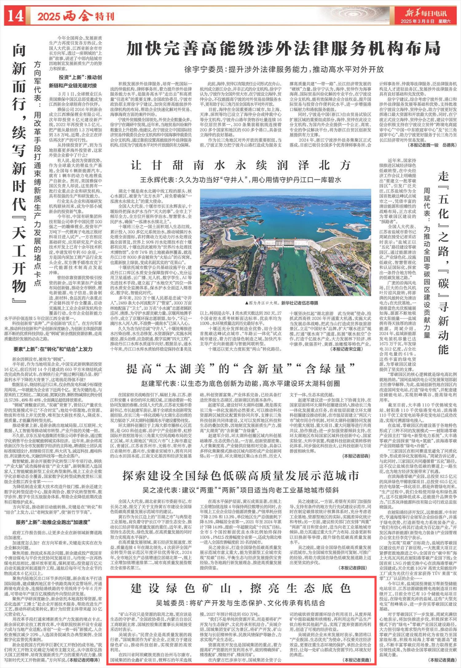 2025年3月8日,《新華每日電訊》第14版刊發(fā)題為《建設(shè)綠色礦山,擦亮生態(tài)底色》的消息,報(bào)道了吳城委員介紹,“我們不是單純的資源開(kāi)采,而是要將礦產(chǎn)開(kāi)發(fā)與生態(tài)保護(hù)、文化傳承有機(jī)結(jié)合?!?/p>