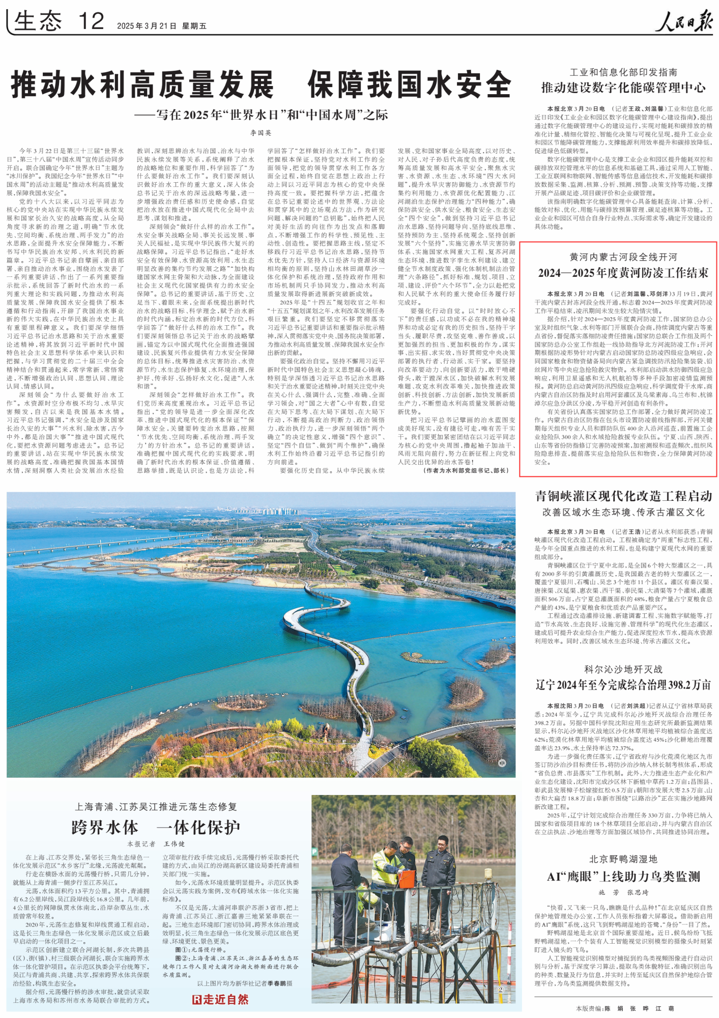 2025年3月21日,《人民日報》第12版刊發(fā)題為《黃河內蒙古河段全線開河 2024—2025年度黃河防凌工作結束》的文章,報道了黃河干流內蒙古封凍河段3月19日全線開通,標志著2024—2025年度黃河防凌工作平穩(wěn)結束,凌汛期間未發(fā)生較大險情災情。