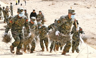 內(nèi)蒙古巴彥淖爾軍分區(qū)發(fā)動(dòng)民兵參與烏蘭布和沙漠治沙攻堅(jiān)戰(zhàn) 植樹造林戰(zhàn)“黃龍”