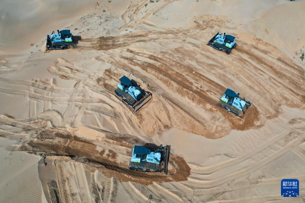 6月7日,在鄂爾多斯市達拉特旗境內的庫布其沙漠,工程機械在平整沙地、開展光伏治沙工程建設(無人機照片)新華社記者 李志鵬 攝