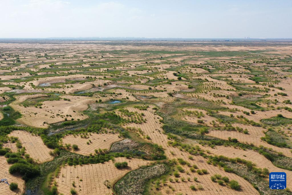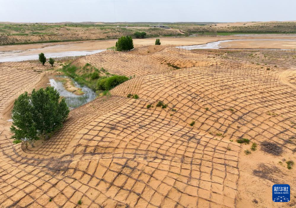 6月7日,在鄂爾多斯市達拉特旗境內的庫布其沙漠,工人在治沙(無人機照片)新華社記者 李志鵬 攝