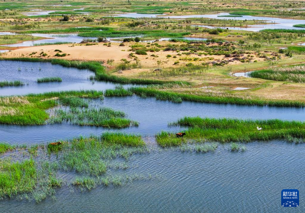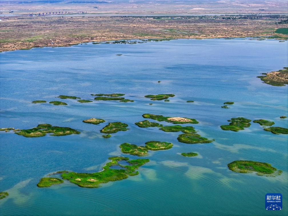 這是位于巴彥淖爾市磴口縣的奈倫湖國家濕地公園(6月5日攝,無人機照片)。新華社記者 連振 攝