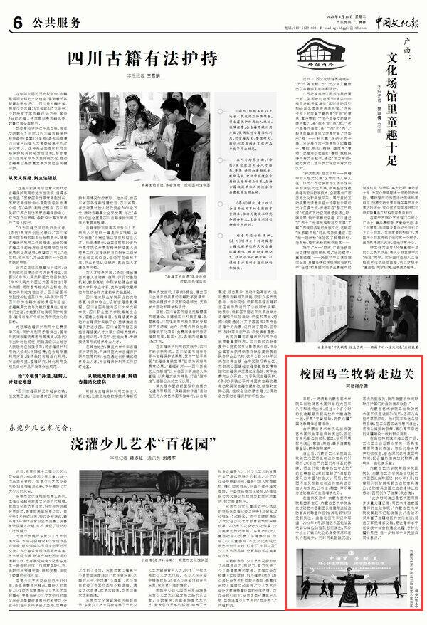 2025年6月11日,《中國文化報(bào)》第6版刊發(fā)題為《校園烏蘭牧騎走邊關(guān)》的文章,報(bào)道了內(nèi)蒙古藝術(shù)學(xué)院烏蘭牧騎藝術(shù)團(tuán)師生來到烏拉特中旗邊防一線,開展慰問演出,歌曲、舞蹈、器樂演奏輪番登場(chǎng),贏得陣陣掌聲。