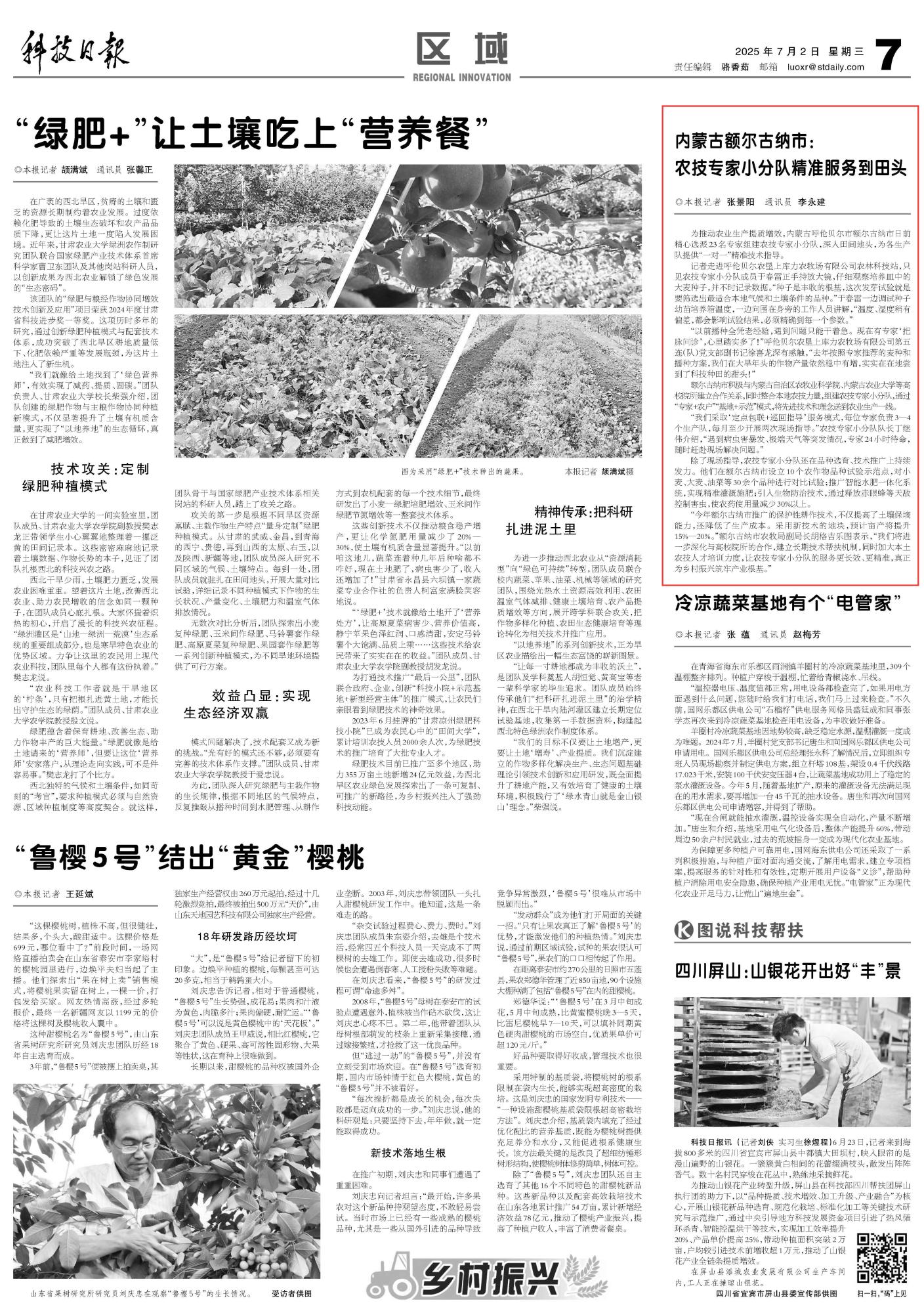 2025年7月2日《科技日?qǐng)?bào)》第7版刊發(fā)了《內(nèi)蒙古額爾古納市:農(nóng)技專家小分隊(duì)精準(zhǔn)服務(wù)到田頭》的文章,報(bào)道了內(nèi)蒙古呼倫貝爾市額爾古納市積極與內(nèi)蒙古自治區(qū)農(nóng)牧業(yè)科學(xué)院、內(nèi)蒙古農(nóng)業(yè)大學(xué)等高校院所建立合作關(guān)系,同時(shí)整合本地農(nóng)技力量,組建農(nóng)技專家小分隊(duì),通過(guò)“專家+農(nóng)戶”“基地+示范”模式,將先進(jìn)技術(shù)和理念送到農(nóng)業(yè)生產(chǎn)一線。