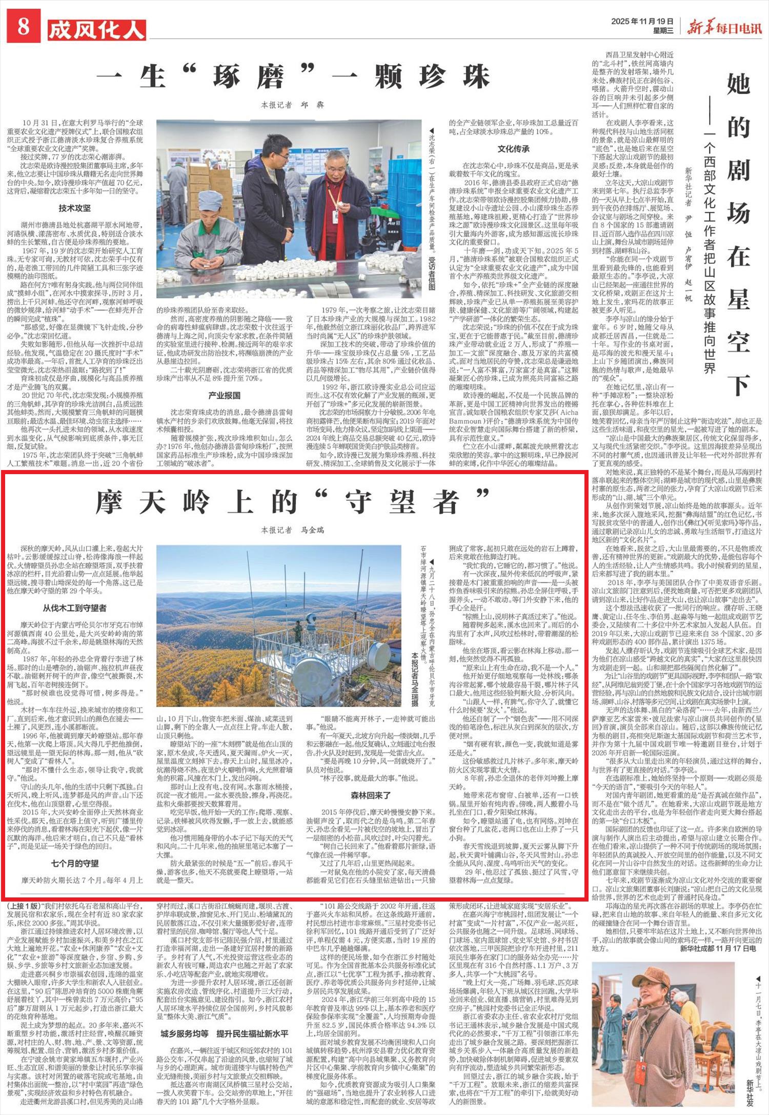 2025年11月19日,《新華每日電訊》第8版刊發(fā)題為《摩天嶺上的“守望者”》的文章,報(bào)道了摩天嶺位于內(nèi)蒙古呼倫貝爾市牙克石市綽河源鎮(zhèn)西南40公里處,是大興安嶺嶺南的第二高峰?;鹎椴t望員孫忠全站在瞭望塔頂,雙手扶著冰涼的欄桿,目光沿著山勢一點(diǎn)點(diǎn)延展。他舉起望遠(yuǎn)鏡,搜尋著山坳深處的每一個角落。這已是他在摩天嶺守望的第29個年頭。