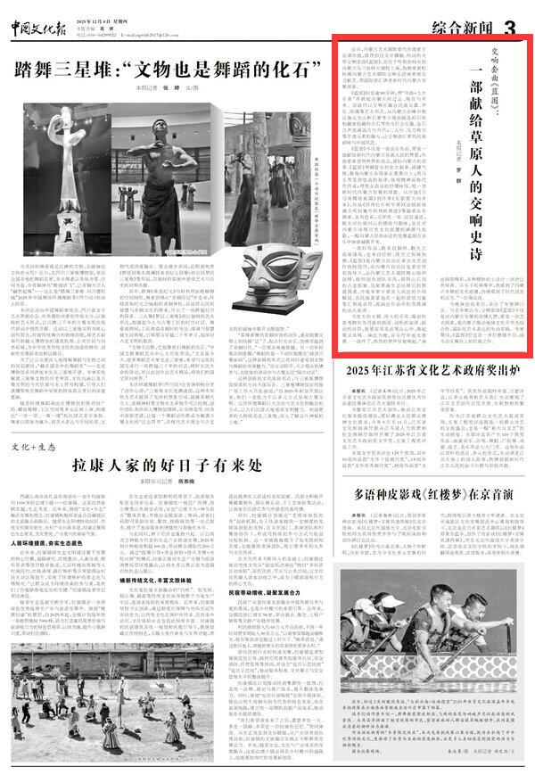 2025年12月4日《中國(guó)文化報(bào)》第3版刊發(fā)了《交響套曲《藍(lán)圖》:一部獻(xiàn)給草原人的交響史詩(shī)》的文章,報(bào)道了近日,內(nèi)蒙古藝術(shù)劇院委約作曲家方崠清作曲,曾偉擔(dān)任文學(xué)撰稿、作詞的大型交響套曲《藍(lán)圖》,在位于呼和浩特市的內(nèi)蒙古烏蘭恰特大劇院上演,指揮家黃屹執(zhí)棒內(nèi)蒙古藝術(shù)劇院交響樂(lè)團(tuán)演奏家合力獻(xiàn)藝,用國(guó)際語(yǔ)匯講述新時(shí)代內(nèi)蒙古發(fā)展故事。