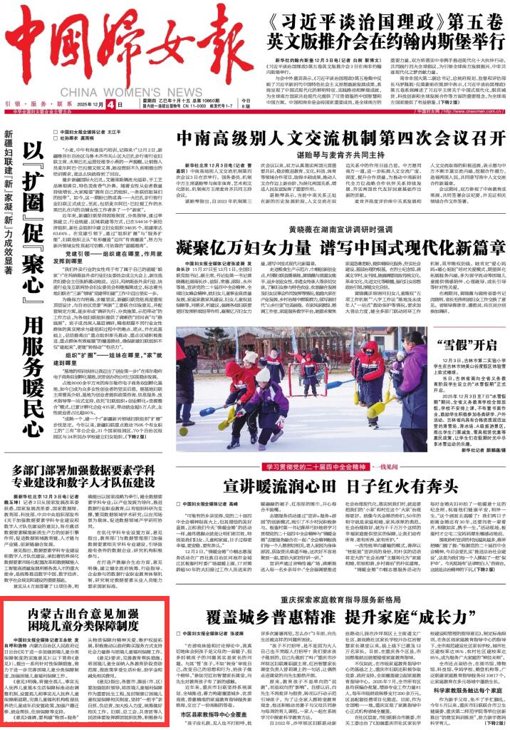 2025年12月4日《中國婦女報》第1版刊發(fā)了《內(nèi)蒙古出臺意見加強困境兒童分類保障制度》的文章,報道了內(nèi)蒙古自治區(qū)人民政府近日出臺《關(guān)于進(jìn)一步加強困境兒童分類保障制度的實施意見》,提出一系列針對性保障措施,致力于進(jìn)一步完善困境兒童分類保障制度,加強困境兒童福利保障工作。