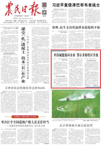 2026年1月29日,《農(nóng)民日?qǐng)?bào)》頭版刊發(fā)題為《科技賦能循環(huán)農(nóng)業(yè) 鄂爾多斯牧區(qū)升級(jí)》的文章,報(bào)道了在內(nèi)蒙古鄂爾多斯市祖祖輩輩“靠天吃飯、逐水草而居”的傳統(tǒng)被改寫(xiě),取而代之的是科技賦能的精細(xì)化種養(yǎng),是貫通三產(chǎn)的新興業(yè)態(tài)。越來(lái)越多的農(nóng)牧民,正沿著“新一產(chǎn)”鋪就的這條路,走向收入更穩(wěn)、底氣更足的好日子?! ?/p>
