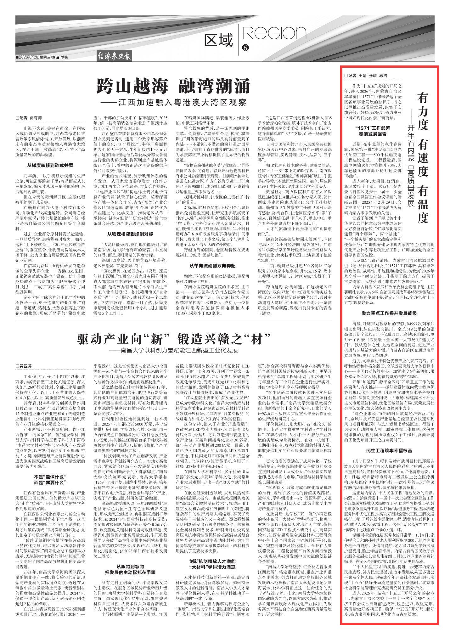 2026年1月28日《經(jīng)濟(jì)參考報(bào)》第6版刊發(fā)了《有力度 有速度 有溫度——開(kāi)年看內(nèi)蒙古高質(zhì)量發(fā)展》的文章,報(bào)道了進(jìn)入2026年,站在“十五五”開(kāi)局之年的起點(diǎn)上,內(nèi)蒙古自治區(qū)黨委十一屆十一次全會(huì)暨全區(qū)經(jīng)濟(jì)工作會(huì)議已擂響前進(jìn)戰(zhàn)鼓:銳意進(jìn)取,攻堅(jiān)克難,高質(zhì)量做好各項(xiàng)工作,確保“十五五”開(kāi)好局、起好步,奮力書寫中國(guó)式現(xiàn)代化內(nèi)蒙古新篇章。