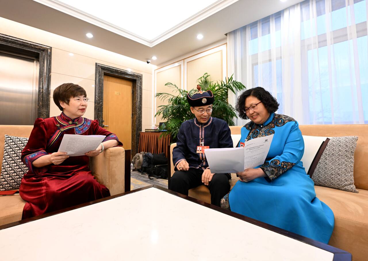 3月4日,住內(nèi)蒙古全國政協(xié)委員杜明燕(右)、納日碧力戈(中)、鄂曉梅(左)就全國政協(xié)常委會工作報告中共同關(guān)注的話題進行交流。草原云記者 韓卿立 攝