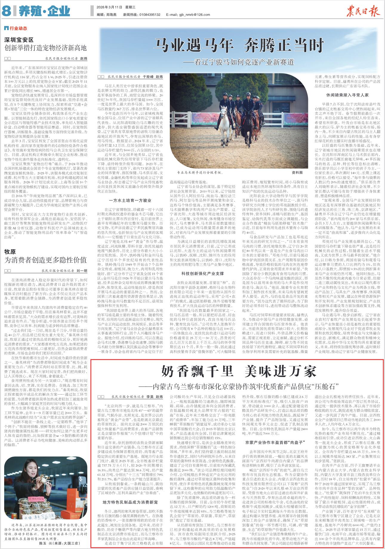 2026年3月11日,《農(nóng)民日報》第8版刊發(fā)題為《奶香飄千里 美味進(jìn)萬家——內(nèi)蒙古烏蘭察布市深化京蒙協(xié)作筑牢優(yōu)質(zhì)畜產(chǎn)品供應(yīng)“壓艙石”》的文章,報道了內(nèi)蒙古烏蘭察布市是世界公認(rèn)的畜牧業(yè)“黃金產(chǎn)業(yè)帶”,也是距離北京最近的草原牧區(qū),面向北京超2000萬居民的超大體量畜產(chǎn)品消費需求,農(nóng)畜產(chǎn)品銷售正是京蒙協(xié)作框架“六個倍增計劃”中的重要內(nèi)容。