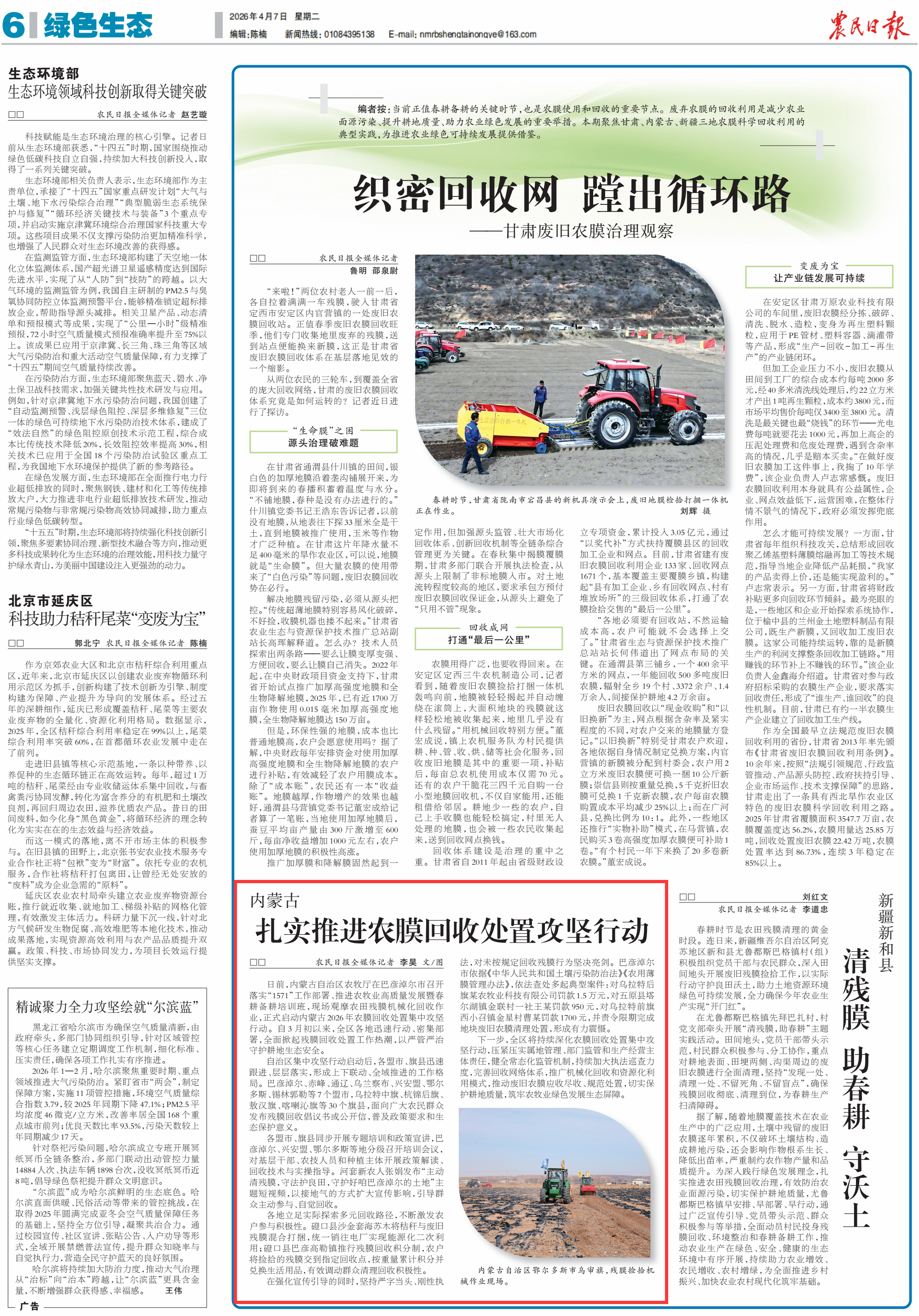 2026年4月7日,《農(nóng)民日報》第6版刊發(fā)題為《內(nèi)蒙古扎實推進農(nóng)膜回收處置攻堅行動》的文章,報道了日前,內(nèi)蒙古自治區(qū)農(nóng)牧廳在巴彥淖爾市召開落實“1571”工作部署、推進農(nóng)牧業(yè)高質(zhì)量發(fā)展暨春耕備耕培訓(xùn)班,現(xiàn)場觀摩農(nóng)田殘膜機械化回收作業(yè),正式啟動內(nèi)蒙古2026年農(nóng)膜回收處置集中攻堅行動。自3月初以來,全區(qū)各地迅速行動、密集部署,全面掀起殘膜回收處置工作熱潮,以嚴管嚴治守護耕地生態(tài)安全。