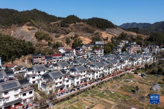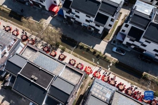2月26日空中俯瞰蓮花鎮(zhèn)戴家新村的百家宴(無人機照片)。