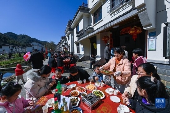 2月26日,游客們在蓮花鎮(zhèn)戴家新村的百家宴上品嘗特色美食。