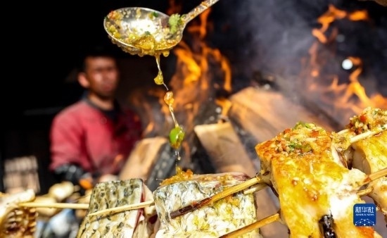 2月26日,在托克扎克鎮(zhèn)農(nóng)貿(mào)市場的一處攤位前,攤主給炙烤的魚塊淋上料汁。