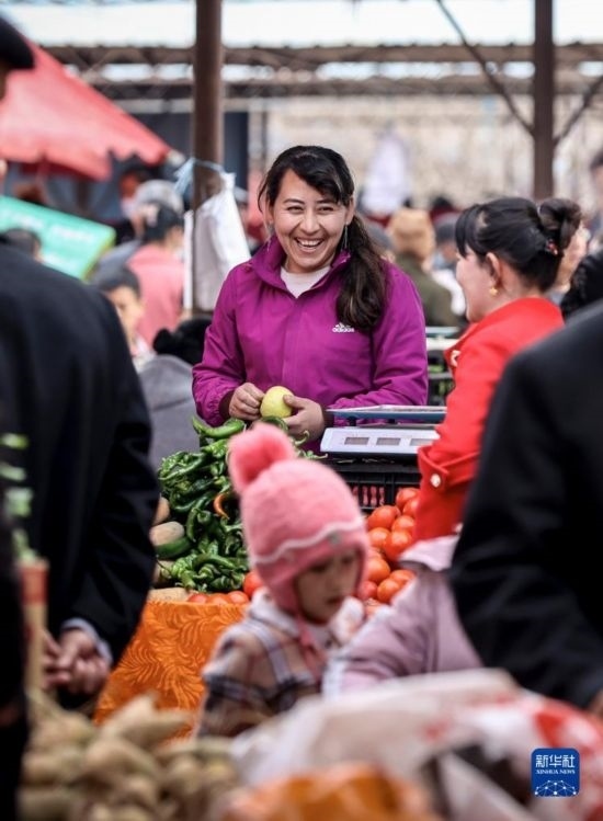 2月26日,在托克扎克鎮(zhèn)農(nóng)貿(mào)市場,蔬菜商販和顧客交流。