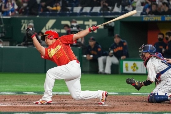 3月9日,中國隊選手梁培慶祝打出本壘打。新華社記者 張笑宇 攝