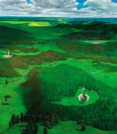 河北塞罕壩林場(chǎng),是“三北”工程建設(shè)的重要區(qū)域?;脑兞趾5娜眽纹孥E,成為近年來(lái)主題性美術(shù)創(chuàng)作的重要課題。入選“筑夢(mèng)——我們的新時(shí)代美術(shù)攝影作品展”的譚智群油畫(huà)《美麗的塞罕壩》,是在實(shí)地寫(xiě)生基礎(chǔ)上的藝術(shù)提煉和情感升華。作者以俯視的構(gòu)圖,鋪展?jié)M目蒼翠的美景。畫(huà)面左側(cè),清澈的河流蜿蜒向前;畫(huà)面右側(cè),白色的雁群逐綠翱翔;遠(yuǎn)方,茂密的森林不斷延伸,風(fēng)力發(fā)電機(jī)林立于山巔,畫(huà)面充滿(mǎn)生機(jī)與活力。同樣以俯視的角度處理構(gòu)圖,孔亮油畫(huà)《美麗中國(guó)——塞罕壩》則以塞罕壩林場(chǎng)和塞罕塔為視覺(jué)中心,蔥蘢的綠意,將意境渲染得更加深邃。翁凱旋油畫(huà)《滄海桑田——塞罕壩的前世今生》,通過(guò)三聯(lián)畫(huà)的形式,在新舊對(duì)比中構(gòu)建時(shí)空長(zhǎng)廊,描繪出塞罕壩的時(shí)代變遷。