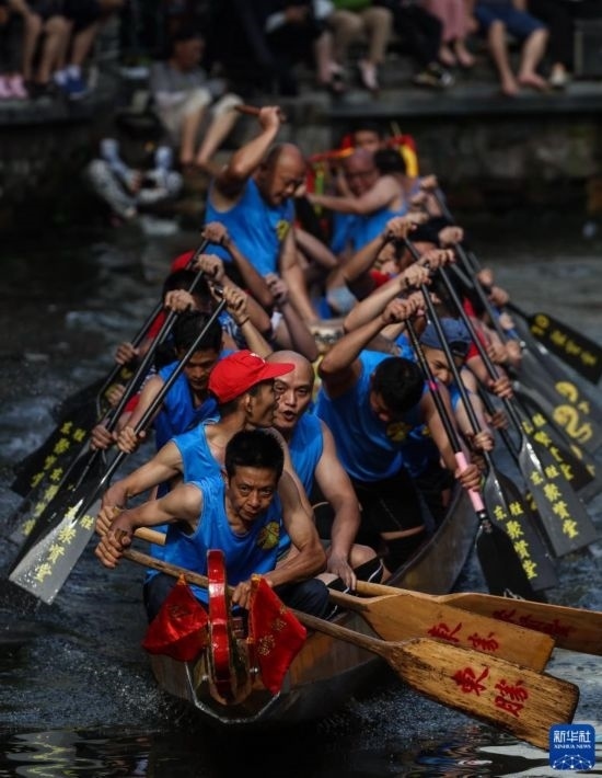 龍船漂移時(shí),船頭船尾的舵手專門負(fù)責(zé)入彎出彎時(shí)的線路和速度控制(6月22日攝)。