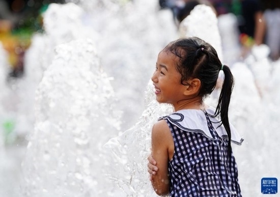 6月23日,小朋友在北京五棵松華熙Live一處噴泉戲水。