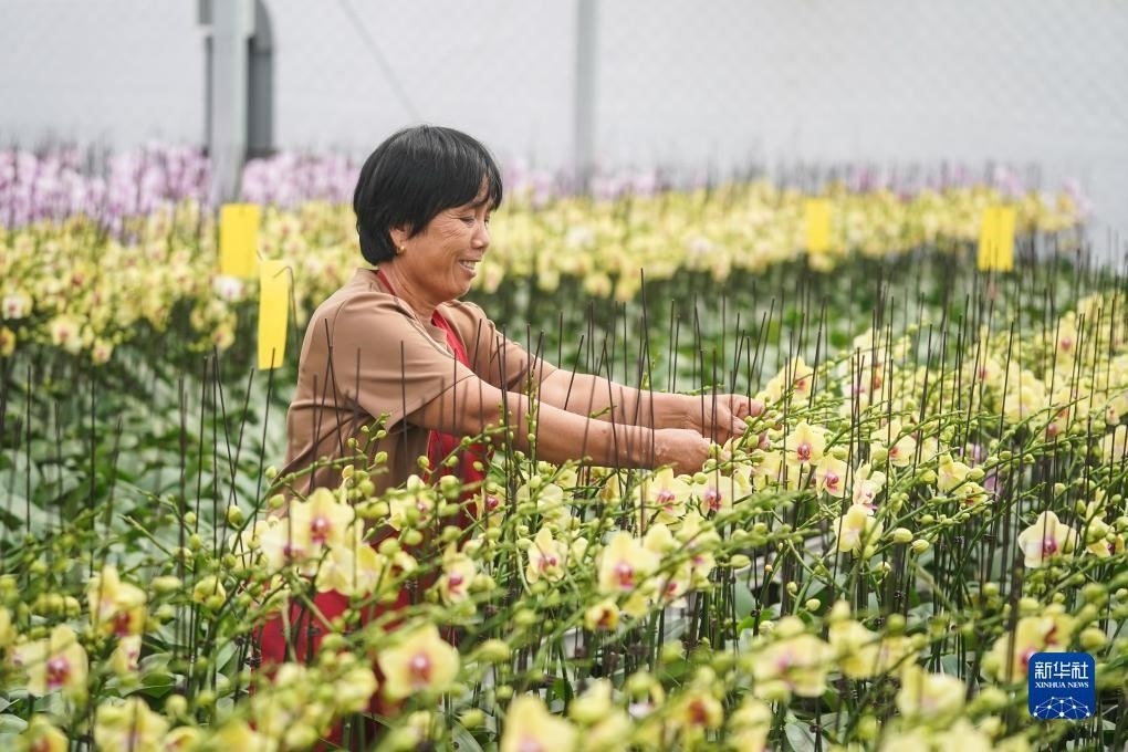 9月9日,農戶在宿遷市王官集鎮(zhèn)蝴蝶蘭大世界大棚內忙碌。