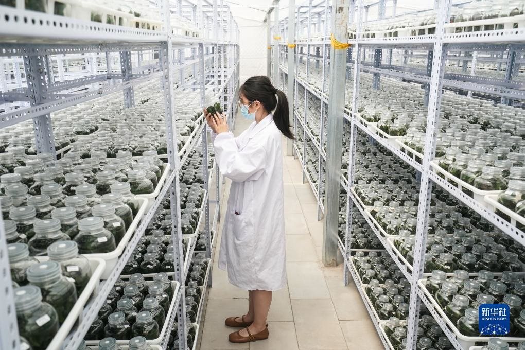 9月9日,技術人員在宿遷市王官集鎮(zhèn)蝴蝶蘭大世界查看瓶苗生長情況。
