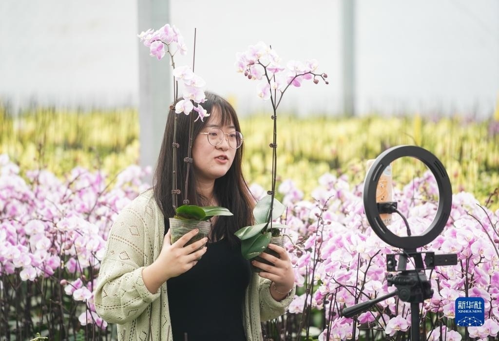 9月9日,工作人員在宿遷市王官集鎮(zhèn)蝴蝶蘭大世界大棚內進行網絡直播。