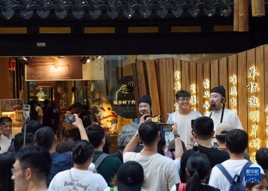 9月17日,在豫園商城,扮演李白、杜甫的演員邀請游客進(jìn)行對詩和猜謎等互動游戲。