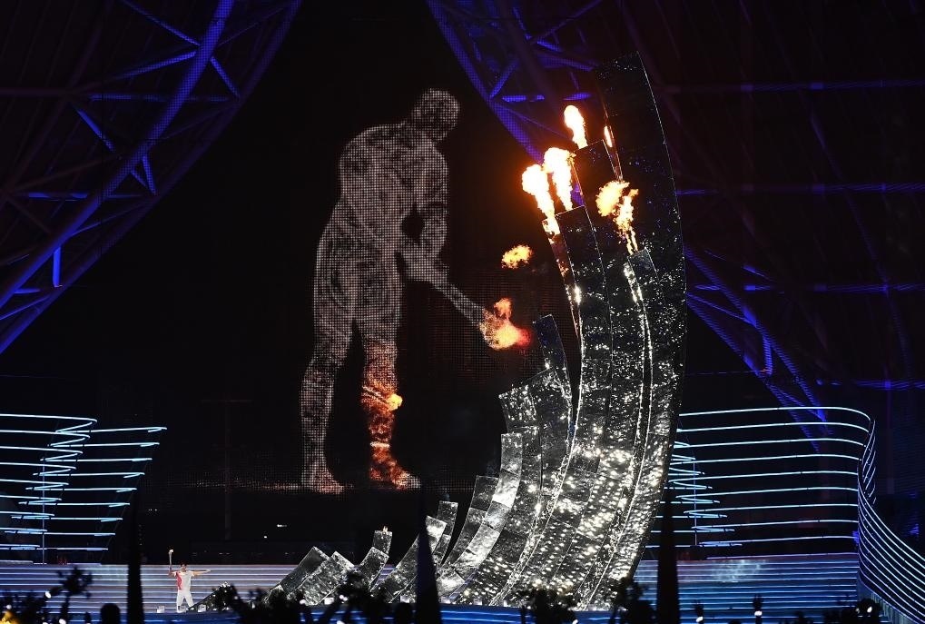 采集自良渚古城遺址的火種,經(jīng)過在浙江11個設區(qū)市的傳遞后,于當晚21時53分抵達杭州奧體中心體育場。場地一側(cè)的主火炬塔“錢江潮涌”,由19根形態(tài)各異的立柱排列組成,象征不同時期舉辦的19屆亞運會。