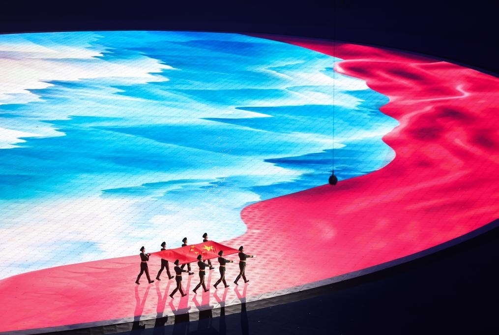 地屏上,一幅紅綢飛掠壯麗河山。8名儀仗兵步伐鏗鏘,護旗入場。“我愛你中國,我愛你春天蓬勃的秧苗……”動人的贊歌深情唱響。