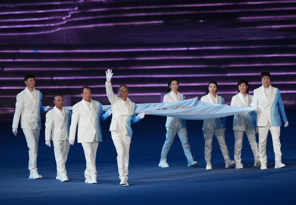 9月23日,亞奧理事會會旗在開幕式上入場。新華社記者 杜宇 攝