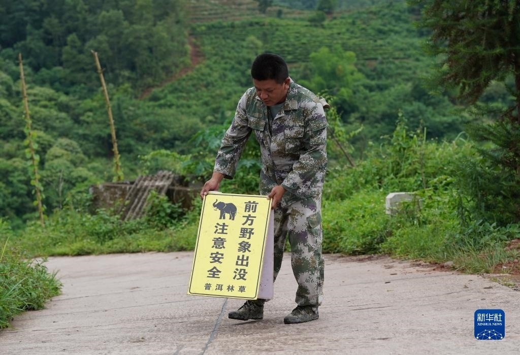 一名監(jiān)測員在野象活動區(qū)域一處道路上設(shè)置警示牌(7月19日攝)。